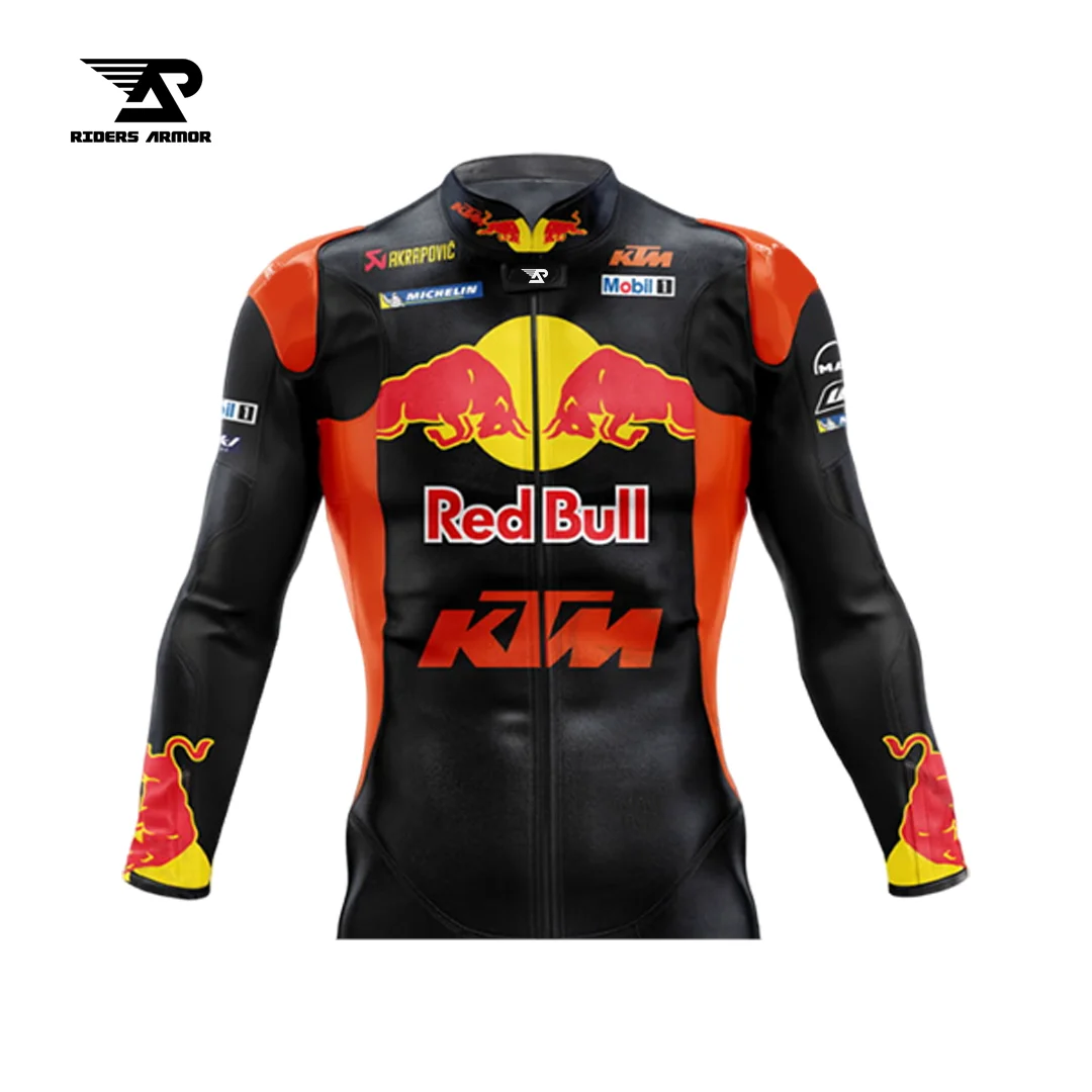 The MotoXcel Jack Miller 2023 Racing Edition Suit is designed for top performance and comfort. Crafted from 1.2-1.3 mm real cowhide leather and Samtex S1 fabric, it ensures complete safety and comfort for the rider. The suit features certified external protections and Level 2 internal protections for the shoulder, elbow, spine, and knee. Inside, a macro mesh liner adds comfort, and all internal protections, including the aerodynamic hump, are removable. Bold Red Bull KTM branding and superior craftsmanship make this suit stand out on the track. Shop now from our Gears for the ultimate racing gear. Enjoy free shipping and easy returns.